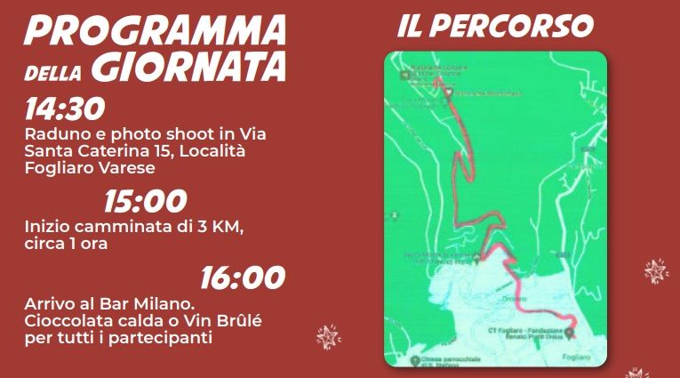 Anche quest'anno è prevista la singolare camminata (all'indietro come i gamberi per chi ha voglia di provare) a sostegno della comunità “Il Pezzettino” (https://www.ilpezzettino.com/) che dal 2016 si occupa di dare supporto ai bambini traumatizzati. L’appuntamento è per l’8 dicembre, dalle 14.30, in via Santa Caterina 15, località Fogliaro (Varese).