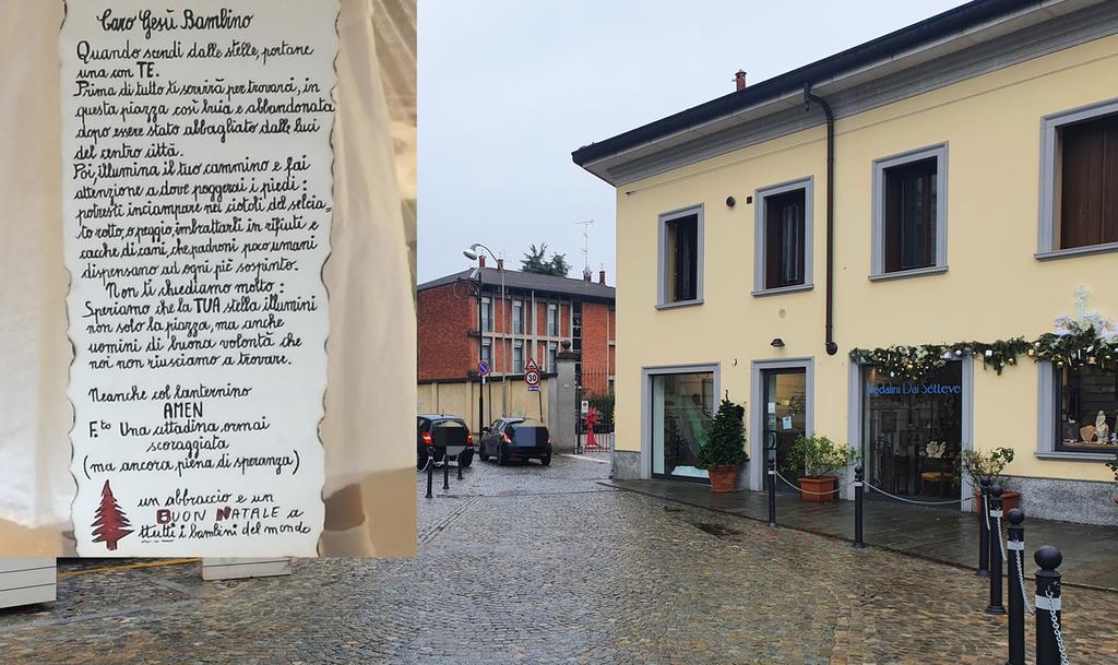 «Caro Gesù Bambino, quando scendi dalle stelle, portane una con te. Prima di tutto ti servirà per trovarci, in questa piazza così buia e abbandonata, dopo essere stato abbagliato dalle luci del centro città».