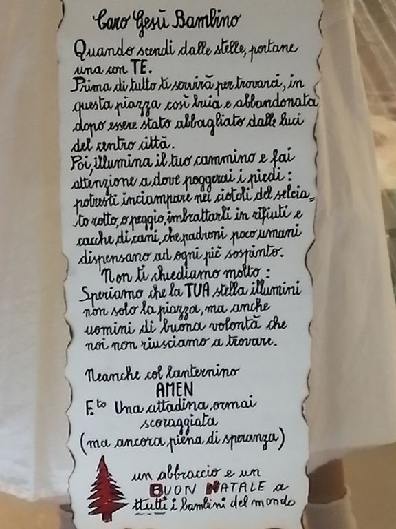 Ecco perché, nella letterina, Sara Pinto mette in guardia Gesù Bambino: «Fai attenzione a dove poggerai i piedi: potresti inciampare nei ciottoli del selciato rotto, o peggio, imbrattarti in rifiuti e cacche di cani che padroni poco umani dispensano a ogni piè sospinto. Non ti chiediamo molto: speriamo che la tua stella illumini non solo la piazza, ma anche uomini di buona volontà che noi non riusciamo a trovare. Neanche col lanternino».