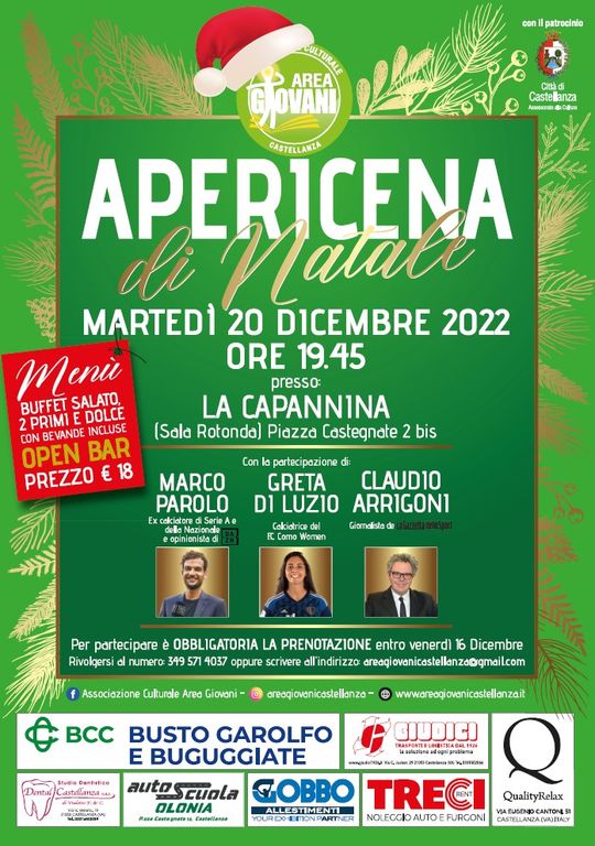 areagiovanicastellanza@gmail.com oppure attraverso i canali social dell’Associazione; l’apericena sarà inoltre arricchita dalla tradizionale tombola di Natale, con numerosi premi in palio.
