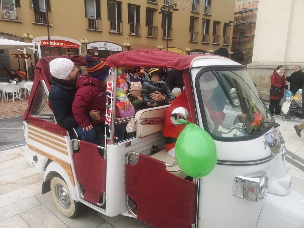 Alle 10 dalla piazza si sono iniziati a sentire i clacson e, poco dopo, via Cavallotti si è tinta di rosso: una schiera di Babbo Natale in sella alle loro vespe hanno fatto capolino tra grandi e piccini che li aspettavano in Santa Maria. All’arrivo anche il sindaco Emanuele Antonelli.