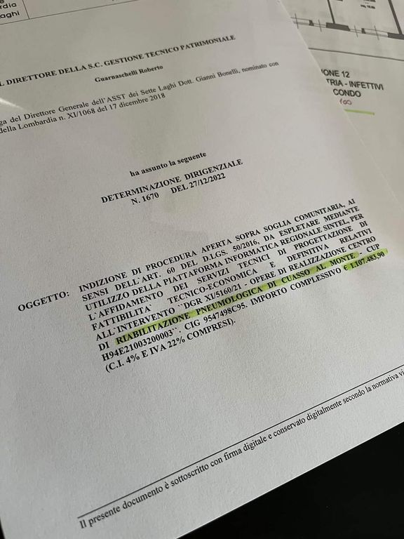 L'intervento, finanziato da Regione Lombardia, ammonta a 24 milioni di euro, di cui 1,1 milione dedicato appunto ai servizi tecnici di progettazione di fattibilità tecnico-economica e definitiva: per la fine del 2026 il Padiglione Centrale e l'ex Convento saranno oggetto di un importante intervento che permetterà di ospitare in quelle sedi il Polo riabilitativo specializzato nella valutazione clinica e nel trattamento farmacologico-riabilitativo dei pazienti affetti da malattie croniche respiratorie, oltre che l'attività di ricerca indirizzata alla patologia cronica respiratoria in collaborazione con l'Università dell'Insubria.