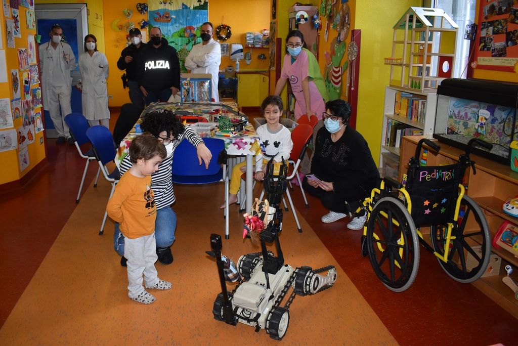 Anche il robot utilizzato dagli artificieri è riuscito a stupire i piccoli che hanno ricevuto alcuni regali direttamente dal mezzo meccanico. Tra i regali consegnati, acquistati dai dipendenti degli Uffici di Polizia coinvolti e adatti all’età dei bambini ricoverati, anche alcune miniature della Lamborghini con i colori della polizia.
