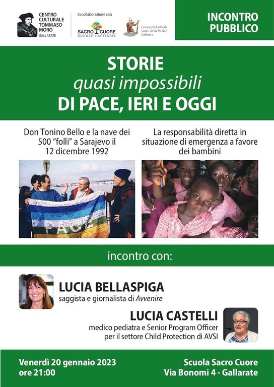 “Storie quasi impossibili di pace, ieri e oggi”. Se ne parla venerdì 20 gennaio alle 21 in un incontro pubblico alla scuola Sacro Cuore di via Bonomi 4, a Gallarate. Interverranno Lucia Bellaspiga, saggista e giornalista di Avvenire, e Lucia Castelli, pediatra e senior program officer per il settore “Child protection” di Avsi.