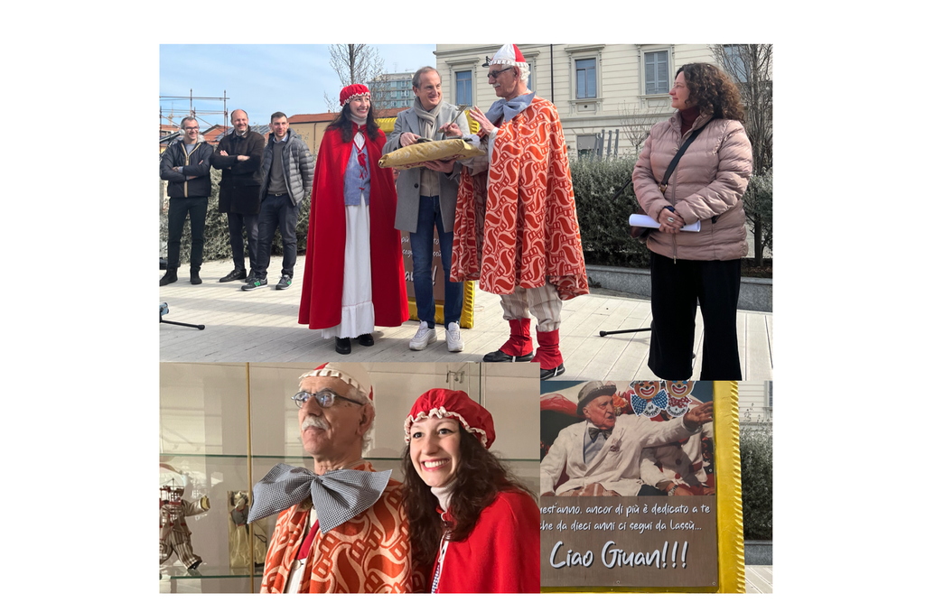 Ma bisogna correre in piazza Vittorio Emanuele, appunto. Tarlisu e Fudreta si dirigono a passo sicuro dove la gente li attende, assieme alle chiavi del municipio. E un grande ritratto: quello di Giovanni Sacconago, re del Carnevale, scomparso dieci anni fa, mentre cinque anni fa mancò Genny Castiglioni, che interpretava prima la Bumbasina. A Giovanni si deve il resistere di questa grande tradizione, oggi c'è il nipote Simone Colombo a guidare la Famiglia Sinaghina e accanto al giovane sul palco il past president Rolando Pizzoli.