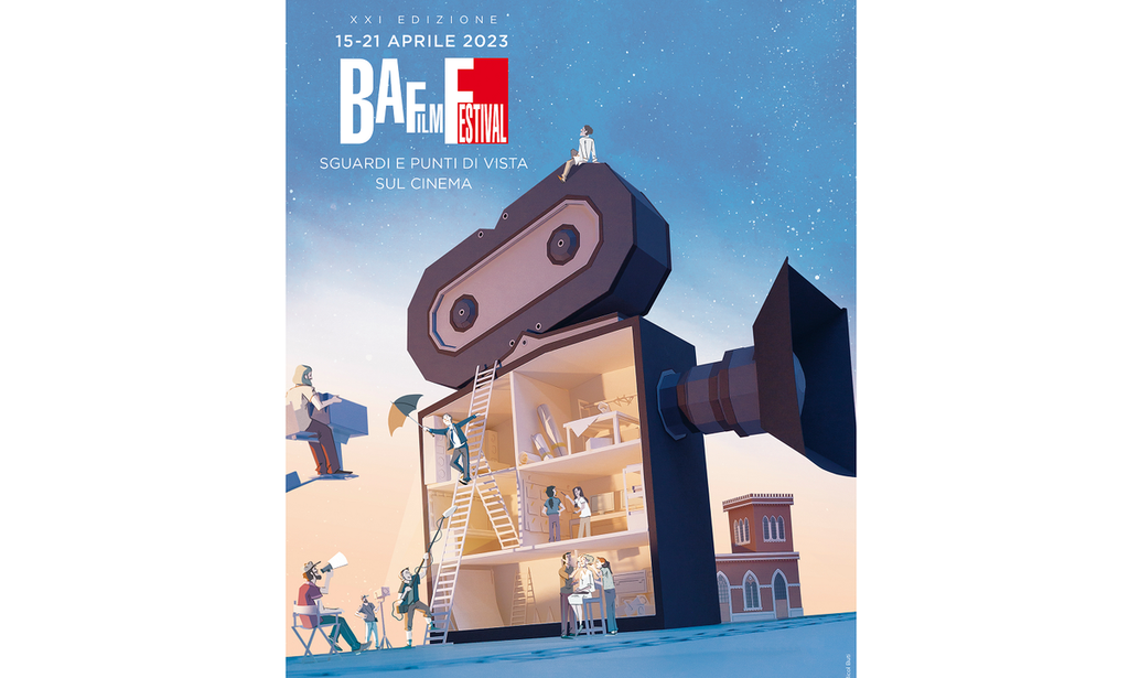 «Nell’illustrazione del manifesto del BA Film Festival ho voluto dare valore a ciò che sta dietro la macchina da presa - spiega l’artista - un mondo fatto di maestranze che interagiscono tra di loro durante le fasi di produzione di un film e che danno vita alla magia del cinema, in una meta-visione in cui tutto viene ripreso dall’occhio della telecamera che, sotto la guida del regista, cattura la coralità in un tutt’uno visivo».