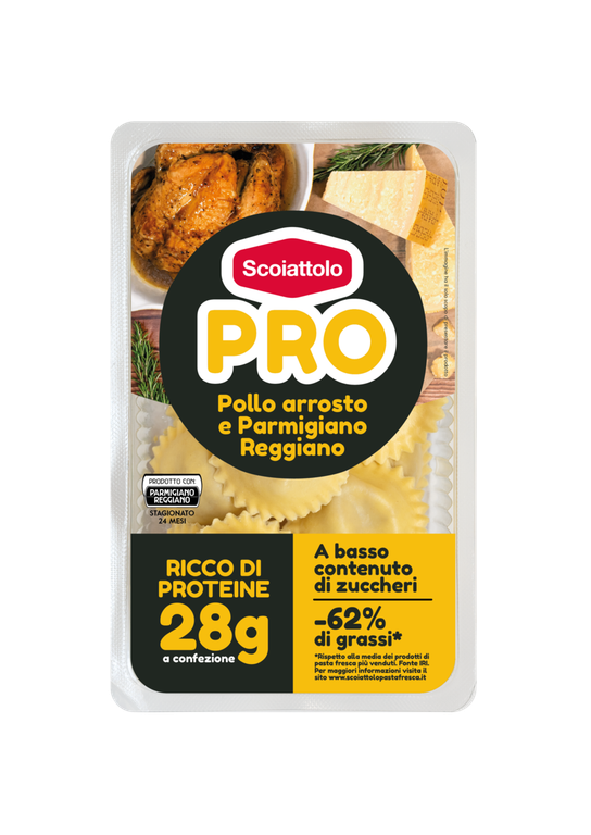ScoiattoloPRO è davvero un prodotto unico nel suo genere: un piatto completo, perché studiato per un corretto equilibrio tra carboidrati, proteine e grassi. La ricetta che mancava per tutti coloro che desiderano limitare l’assunzione di calorie, grassi e carboidrati e, al contempo, introdurre proteine senza rinunciare alla golosità di un buon piatto di pasta fresca ripiena. Unendo un condimento o contorno di verdure ai ravioli proteici si ottiene un piatto unico, bilanciato e maggiormente digeribile.