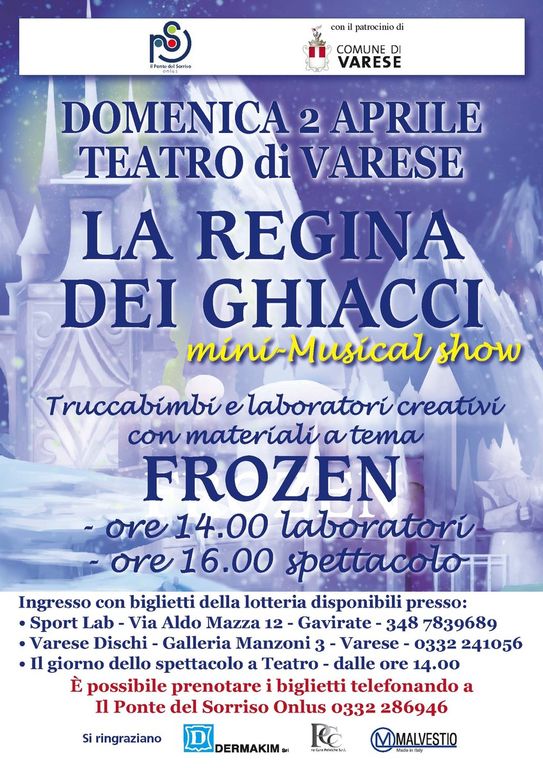 Il Ponte del Sorriso organizza un pomeriggio di laboratori e truccabimbi a tema Frozen con spettacolo musical La Regina dei ghiacci. Lo scopo è quello di raccogliere fondi per l'acquisto di un letto tecnologico da sala operatoria per l’Ortopedia Pediatrica dell’Ospedale Del Ponte, diretta dal dottor Giacomo Riva.
