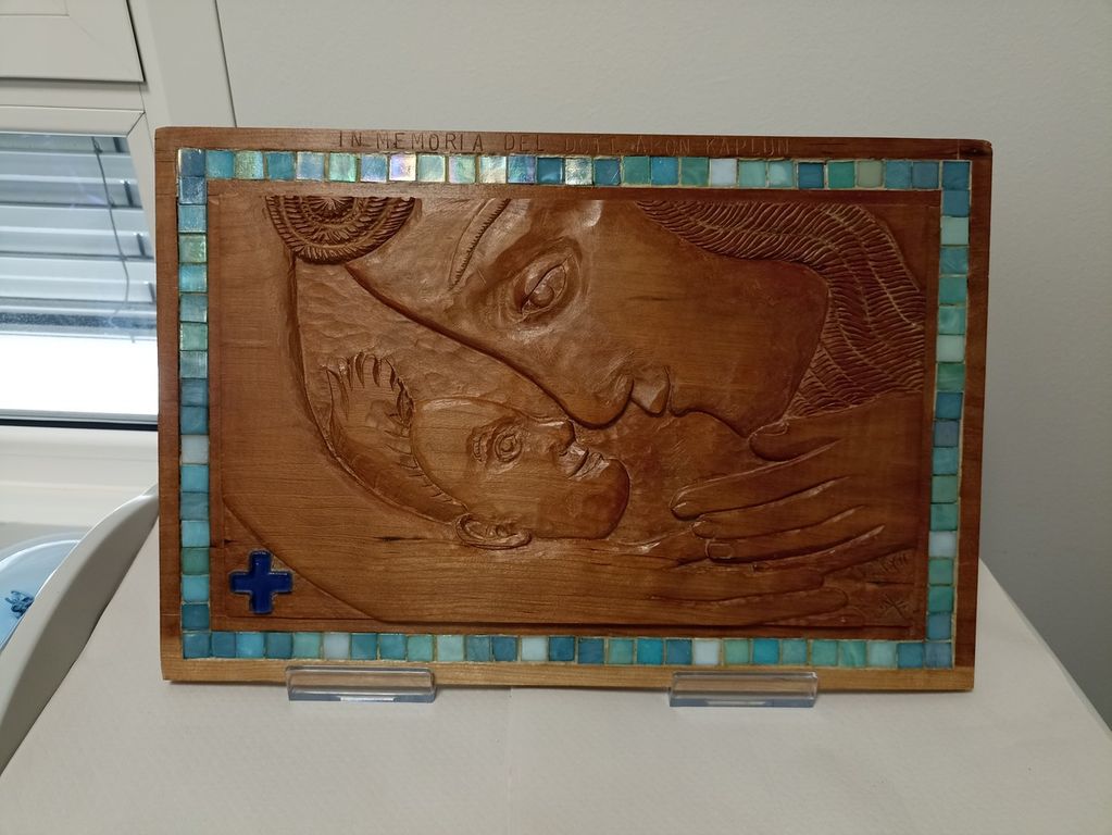 Alla presenza della moglie, della figlia e di altri ospiti, l'artista Davide Zaffaroni ha donato in suo ricordo una scultura in legno raffigurante una madre con il suo bambino.