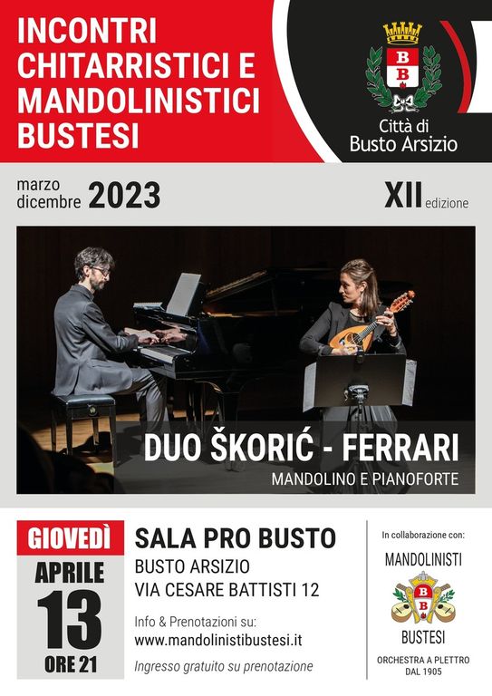 Si terrà giovedì 13 aprile alle ore 21.00 alla Sala Pro Busto, il secondo appuntamento della XII edizione degli Incontri Chitarristici e Mandolinistici Bustesi, che vedrà protagonista il Duo mandolino e pianoforte formato da Dea Škorić e Giacomo Ferrari.