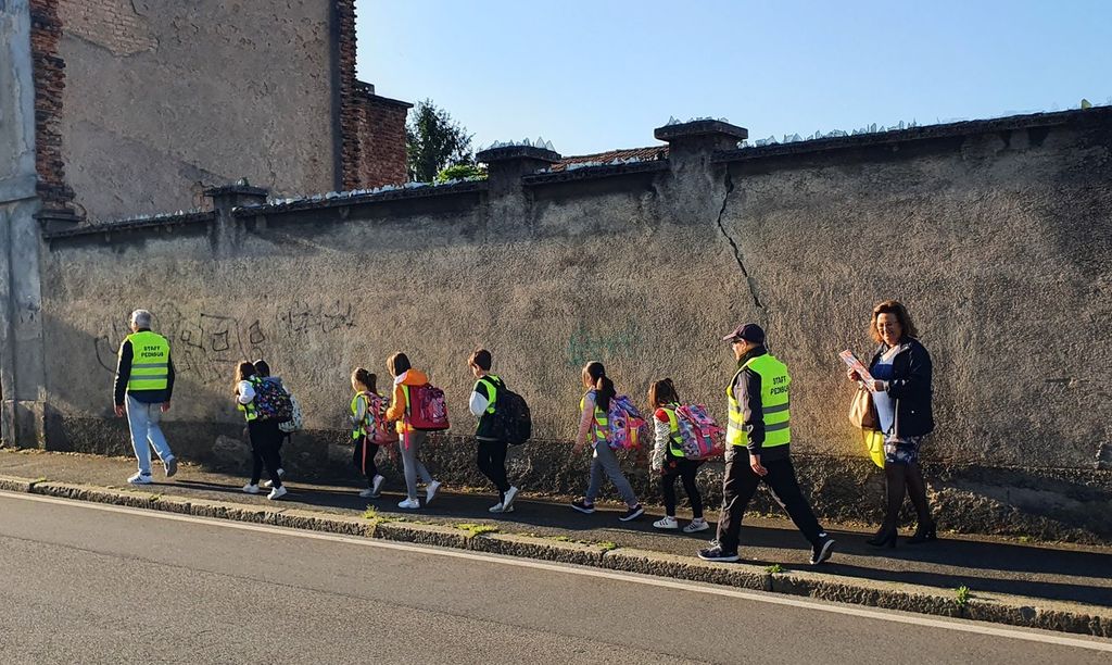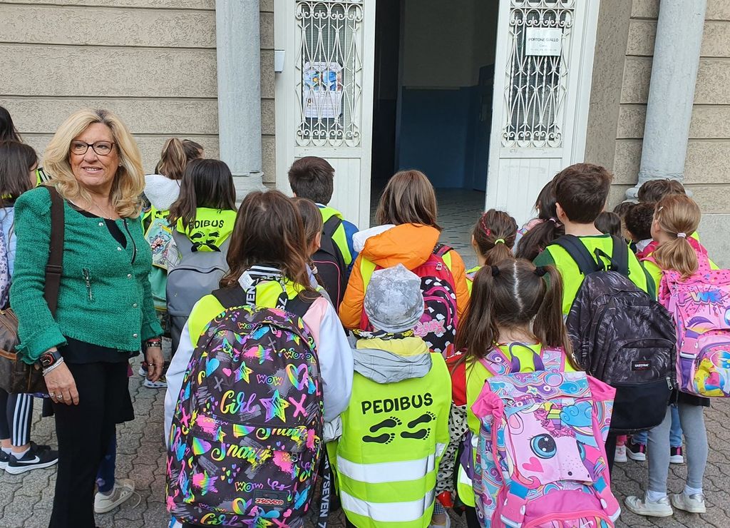 Pettorina gialla fluorescente, fischietto in bocca e via! È partito questa mattina il “PediBusto” delle scuole Manzoni.