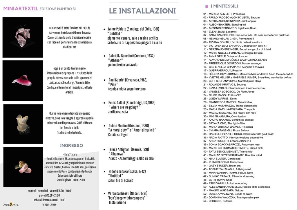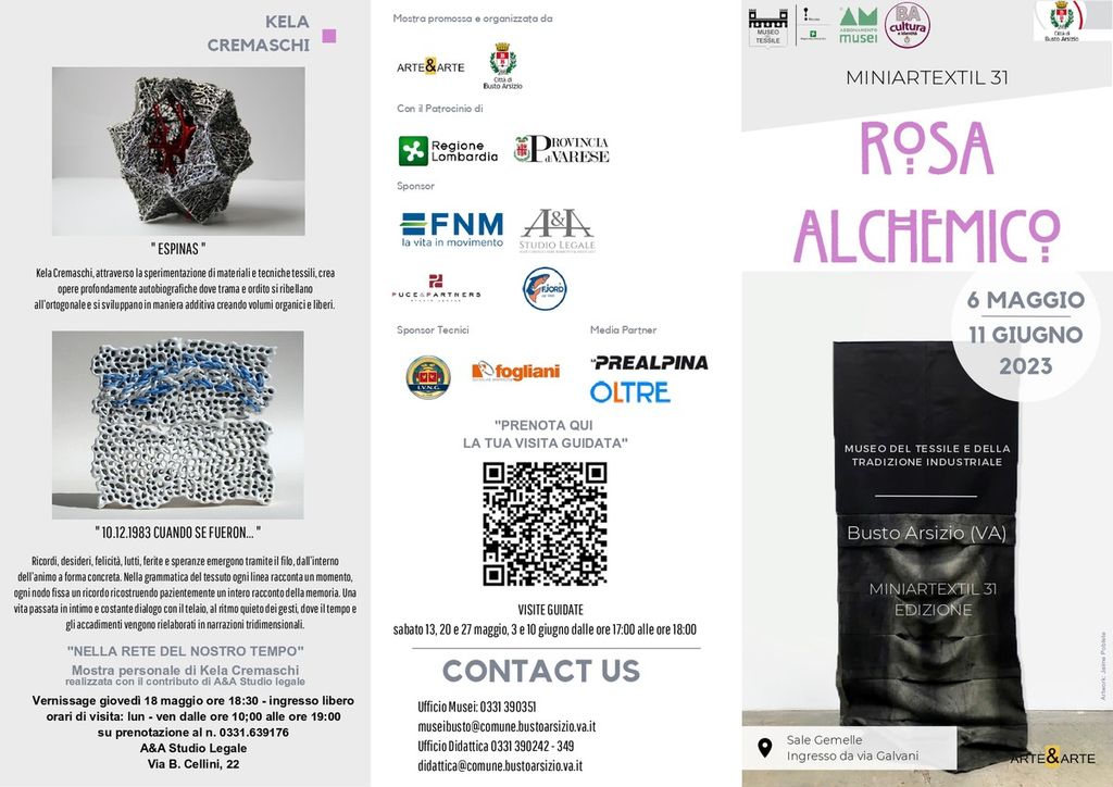 A Busto è la quarta volta nel segno di Miniartextil, Rosa alchemico, il tema che dipinge le sale gemelle e non solo, con 54 minitessili e 8 grandi opere di fiber art, firmate da Teresa Antignani, Gabriella Benedini, Raul Gabriel, Veronica Bisesti, Ruben Montini, Jaime Poblete, Emma Talbot, Hideho Tanaka.