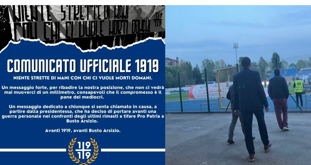 Il testo: «Un messaggio forte, per ribadire la nostra posizione, che non ci vedrà mai muoverci di un millimetro, consapevoli che il compromesso è il pane dei mediocri. Un messaggio dedicato a chiunque si senta chiamato in causa, a partire dalla presidentessa, che ha deciso di portare avanti una guerra personale nei confronti degli ultimi rimasti a tifare Pro Patria a Busto Arsizio. Avanti 1919, avanti Busto Arsizio».