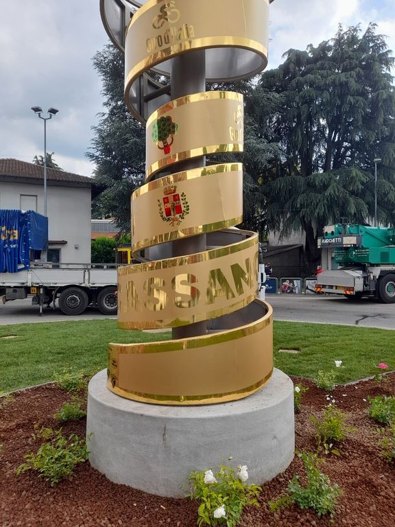 Con la spirale che è sport e conquista, che è radici e vetta. In un punto nevralgico della città, la scultura riproduce il trofeo appannaggio del vincitore della corsa rosa. Troneggia sulla rotatoria più frequentata a Cassano Magnago, città di tappa.