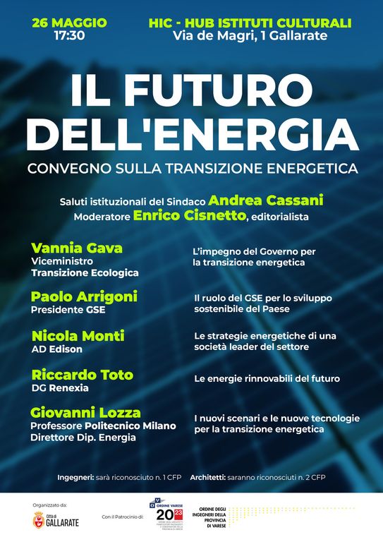 Il Comune di Gallarate organizza un convegno dedicato alla discussione sulle sfide e le opportunità legate alla transizione energetica verso fonti più pulite e sostenibili: “Il Futuro dell’Energia”. L’evento si terrà il 26 maggio, alle 17:30, all’Hic di via De Magri, 1 (locandina in fondo).