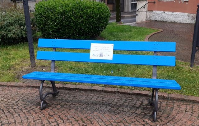 Sulla panchina blu è stata apposta una targa con riportate due frasi: