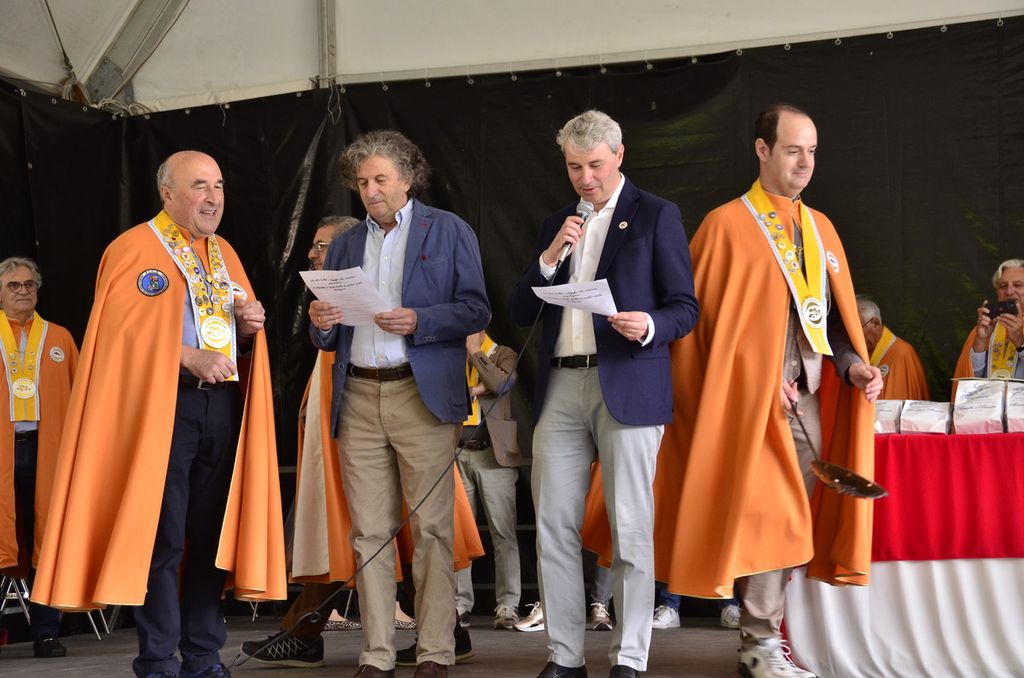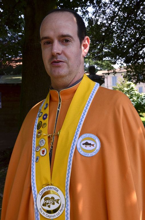 Il sindaco Galimberti, dopo aver espresso il suo plauso per lo sforzo della Confraternita di difendere la cultura che c’è dietro i piatti della tradizione locale, ha letto la formula per la sua intronizzazione, “benedetta” dal colpo di schiumarola del presidente Francesco Campi, dopo il giuramento di non mantecare mai il riso in cagnone. Che non è un risotto, ma deve essere bollito e scolato, poi mischiato con burro fuso, salvia e un po’ di parmigiano, “letto” ideale per adagiare i filetti di “pess persic” impanati e fritti.