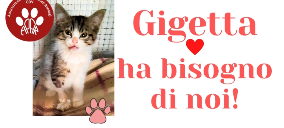 Gigetta è una gattina di circa 2 mesi, ma nella sua breve vita ha avuto già sfortuna e fortuna allo stesso tempo. Trovata in autostrada, all'uscita di Busto Arsizio, deve aver subìto un trauma e ha la mandibola rotta. La fortuna è che l'avventura poteva avere conseguenze ancora peggiori e che ora è nelle amorevoli mani dei volontari dell'Apar di Busto.