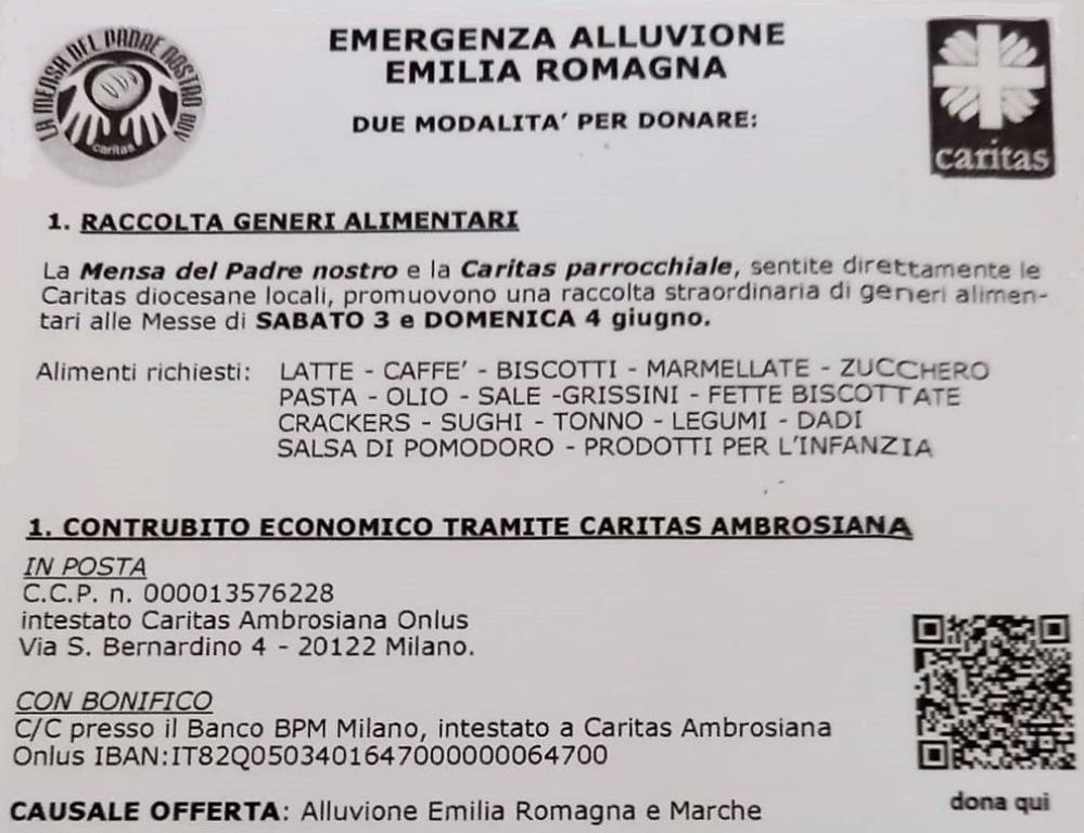 È per questo che i volontari della Mensa del Padre Nostro hanno deciso di fermarsi con il proprio furgoncino all’uscita delle messe di sabato 3 giugno e di domenica 4 per raccogliere generi di prima necessità, che saranno poi destinati ad aiutare chi si trova in difficoltà a causa dell’alluvione in Emilia Romagna.