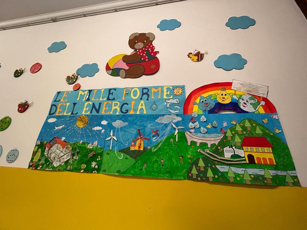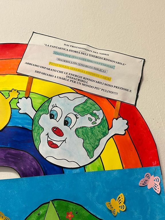 Le insegnati di Villa Sioli, dopo aver mostrato ai bambini un video intitolato: “La fantastica storia delle energie rinnovabili” che ha come protagonisti “Magoutte” (la gocciolina d'acqua), “Tourbillon” (il vento) e “Petit Soleil” (il sole), e, che spiegava in modo accattivante come potevano essere utilizzate le energie, hanno fatto scegliere ai bambini una delle energie rinnovabili da illustrare su un cartellone, utilizzando vari materiali e diverse tecniche proprio per consentire ai più piccini di dare il proprio contributo alla realizzazione del cartellone: ecco il risultato vincente, nelle foto.