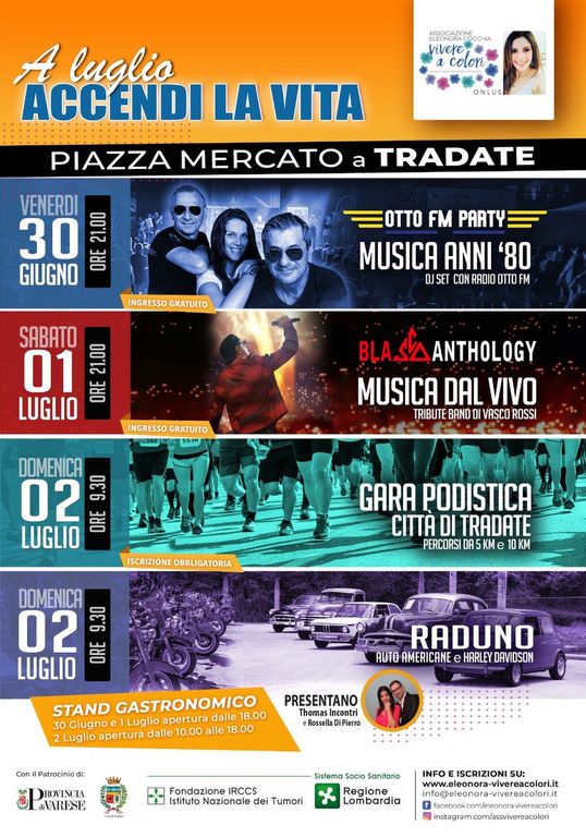 L’Associazione Eleonora Cocchia Vivere a Colori Onlus presenta la quarta edizione di “A luglio accendi la vita”, una tre giorni di festa in piazza mercato a Tradate.