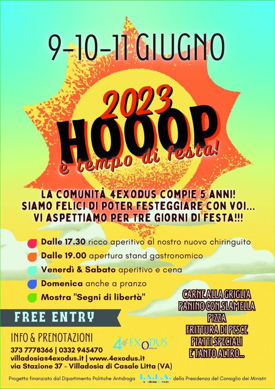 Dal 9 giugno, a partire dalle ore 18:00 con l’aperitivo, fino a domenica sera 11 giugno la comunità di Villadosia 4Exodus, come consueto, riaprirà le porte per accogliere all’insegna del buon cibo e dell’allegria gli amici di sempre e quanti, nei suggestivi spazi all’aperto della Cascina, vorranno sperimentare un momento di serena convivialità. Festeggeremo il quinto compleanno della Comunità e oltre al buon cibo, alla bellezza del luogo e alla simpatia ad accogliervi ci saranno i ragazzi della “Casa” che come sempre sono i veri protagonisti di ogni evento: si occuperanno della cucina, dell’allestimento, del servizio e dell’animazione, dedicando spazio anche alla presentazione delle loro opere esposte nella mostra “Segni di libertà”.