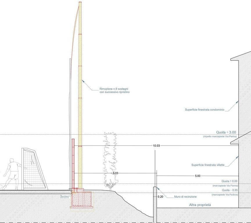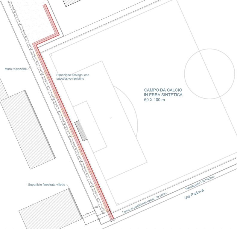 Il progetto contempla la realizzazione di una barriera acustica tra il campo sportivo in via Parma e le abitazioni che affacciano su via Monza per ridurre l’impatto acustico generato dall’attività sportiva sui residenti. La soluzione progettuale individuata, che parte dalla relazione tecnica di impatto acustico svolta da una professionista iscritta all’Elenco nazionale dei tecnici competenti in acustica, prevede la realizzazione di una barriera alta 3 metri, opaca e con caratteristiche fonoassorbenti. La barriera sarà posta lungo il perimetro sud-ovest del campo da calcio e avrà l’andamento di una linea spezzata.