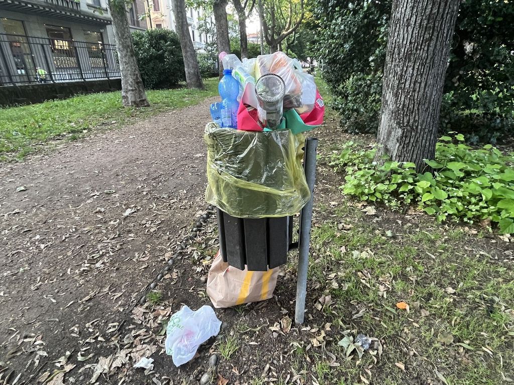 Sì, i cestini si erano riempiti, ma a quel punto buona prassi sarebbe portare via la borsa con i propri rifiuti e smaltirli con tutti i crismi a casa. O cercare a maggiore distanza un altro portarifiuti. Proprio in questo parco, ad esempio, ieri sera bastava fare qualche passo e si trovava un cestino completamente vuoto verso via Manara.