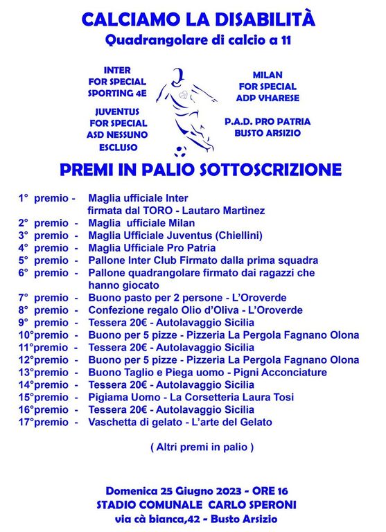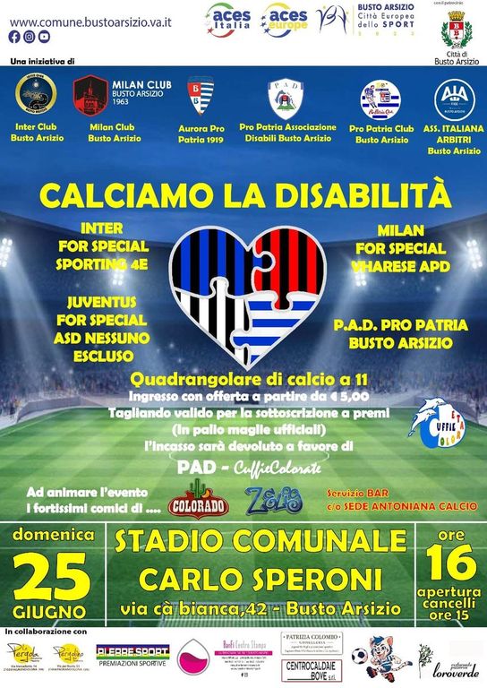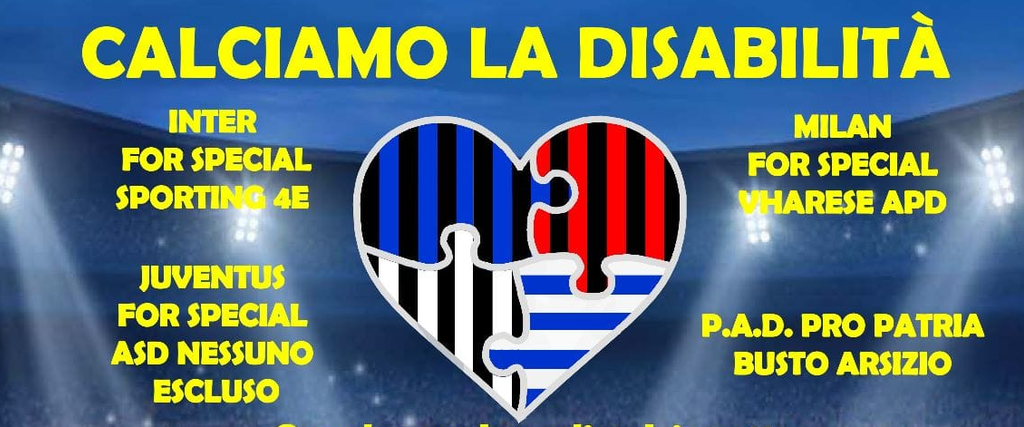 Tutti insieme, un unico grande cuore come urla il manifesto, con un obiettivo: «Calciamo la disabilità». Se le realtà citate sono gli organizzatori, il quadrangolare di calcio a 11 che inizierà alle ore 16, vedrà sfidarsi le squadre paralimpiche, Milan for special Vharese Apd, Inter for Special Sporting 4E, Juventus for Special Asd Nessuno escluso e Pro Patria Pad. Ci si sfida, si sorride con i cabarettisti di Colorado e Zelig e ci sarà il servizio bar alla vicina Antoniana. Il tutto con una missione importante: aiutare i super sportivi ragazzi delle Cuffie colorate, che stanno cercando di comprare casa per l'associazione. LEGGI QUI