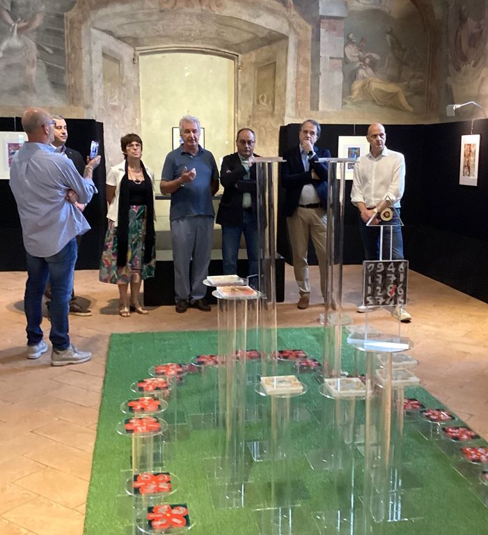 Qui trentaquattro opere sono appese alle pareti: una grande su tela e le altre in acrilico su acetato, papiro e plexiglass. Tredici formelle (cm. 14x14) dal titolo Flowers - Myosotis sono sistemate in una bacheca, mentre nell’altra sono in bella vista cinque piatti in ceramica dal titolo Animals (diam, cm 24) che fanno parte della collezione che ha dato vita a una bellissima personale dell'artista nel 2013 al Midec (Museo internazionale del design ceramico) di Cerro di Laveno.