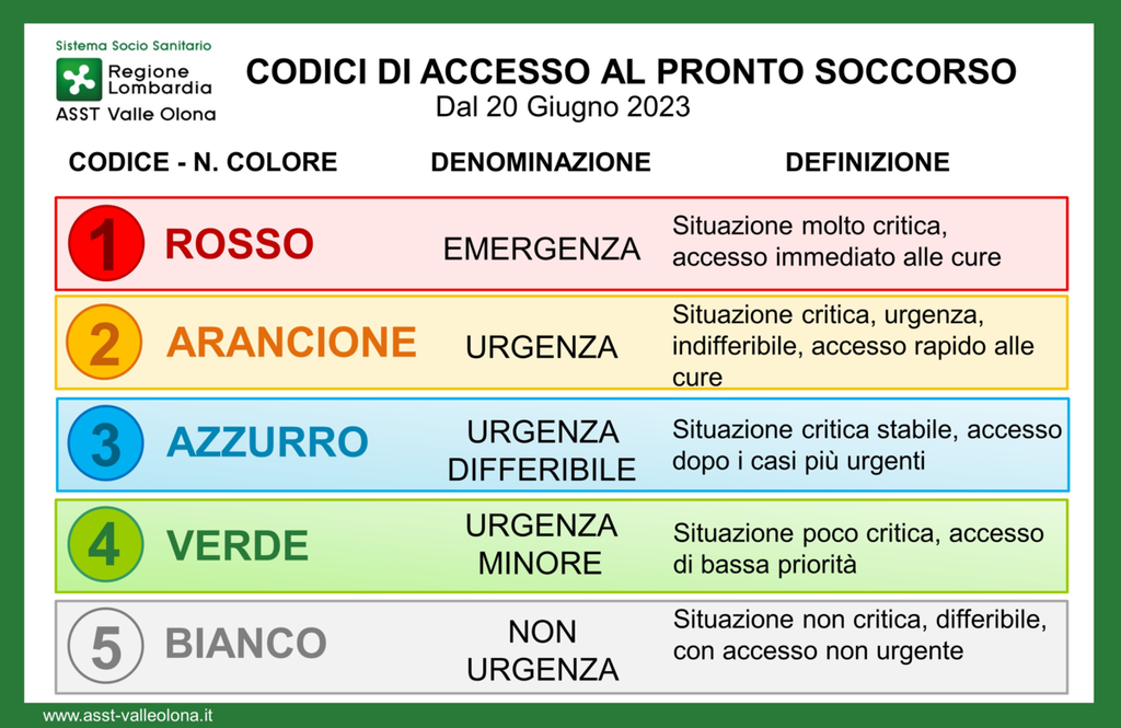 Si tratta di un nuovo sistema di triage, composto da cinque codici numerici, che seguono le linee guida a livello nazionale in merito al triage intraospedaliero.