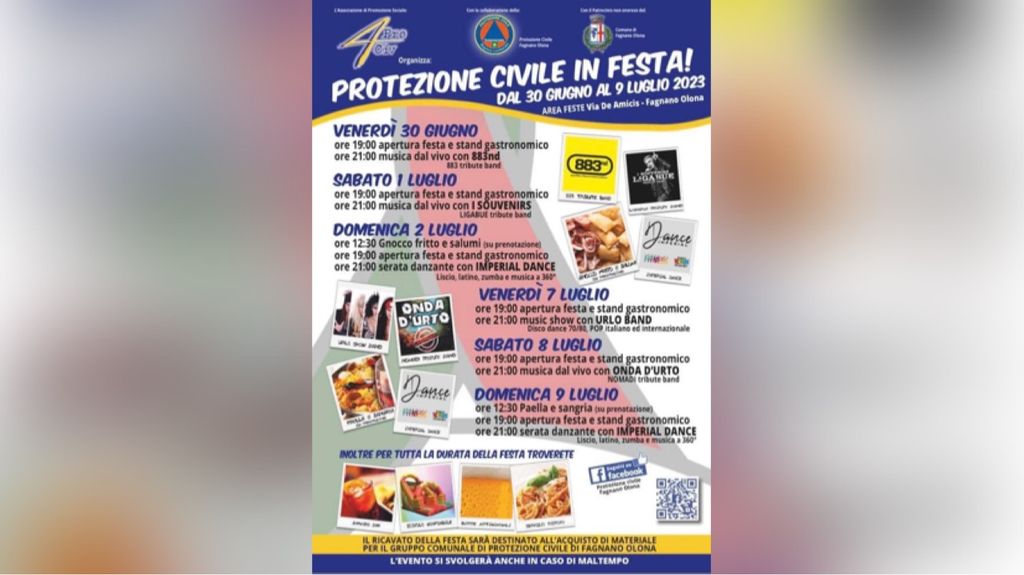 La Protezione Civile di Fagnano Olona quest’anno festeggerà, per due weekend consecutivi, con un programma molto ricco tra musica, divertimento e buon cibo.