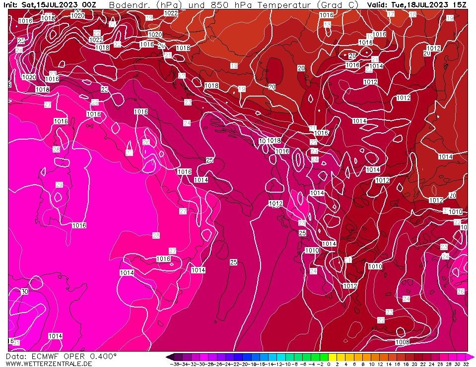 «Le carte riportate si riferiscono alla temperatura a 1.500 metri di quota per martedì sera. La +30°C (anomalia termica fino a 12°C) arriverà a lambire Sardegna e Sicilia. Ciò corrisponde a temperatura massime che potranno raggiungere, e superare, 45°C nelle zone interne. È molto probabile che vengano superati alcuni record di temperatura (sia massima, che minima)» spiega Bertoni.