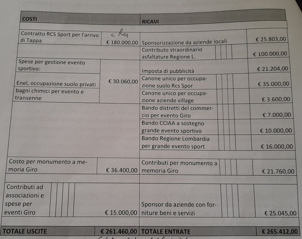 Gli interrogativi più pressanti, nelle settimane successive al turbine rosa che ha avvolto Cassano, sono vorticati intorno alla situazione economica e finanziaria. Alla voce costi, ci sono 180mila euro corrisposti a Rcs; 30mila fra spese di gestione, Enel, occupazione di proprietà private e attrezzature; riproduzione monumentale del trofeo “Senza fine” (36.400 euro); contributi ad associazioni e spese per eventi a tema (15mila). Totale: 261.500 euro circa. I ricavi sommano sponsorizzazioni di aziende locali (25.800); contributo regionale per asfaltature (100.000); imposta sulla pubblicità (21.000); occupazione suolo di Rcs (35mila), canone unico per aziende nel village (3.600); bandi (33mila fra distretti del commercio, CCIAA, Regione/Sport); contributi privati per il monumento a memoria del giro (21.800 euro circa). Totale 265.500 euro circa. Seppure di poco, l’evento in sè è arrivato in terreno positivo. Numeri sui quali Poliseno ha fatto diverse precisazioni. Ne segue una sintesi