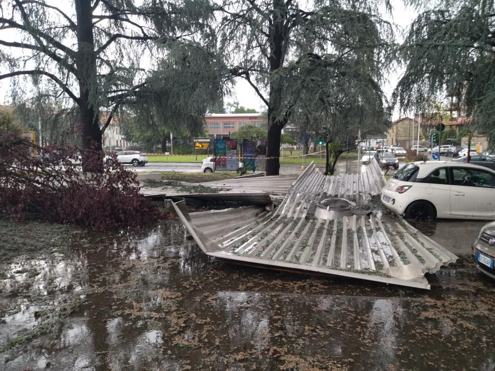 Danni e tettoie volate a terra a Parabiago (foto Ezio Conti via NaturalMeteo). Sotto nella gallery auto investite dal crollo di un gigantesco ramo a Saronno (foto da IlSaronno.it), due immagini degli interventi dei vigili del fuoco in provincia e la parte di tetto del centro commerciale "Il Centro" crollata