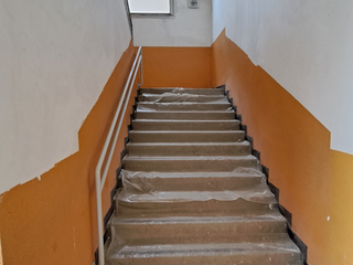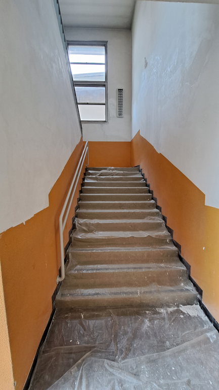 Si sta inoltre provvedendo alla posa delle botole di ispezione per gli impianti di scarico dei bagni e dei locali di servizio e alla rimozione dell’intonaco da alcune pareti, sostituito con il nuovo intonaco armato in fibra di vetro.