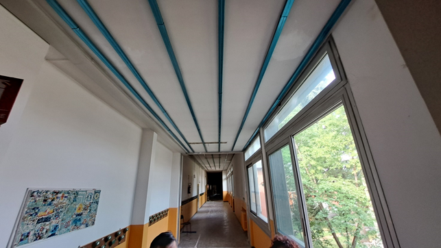 È infatti in stato avanzato la rimozione delle controsoffittature esistenti, per la successiva posa dei nuovi controsoffitti modulari antisfondellamento nei corridoi e nelle aule, e la sostituzione dei corpi illuminanti con pannelli a led, a minor consumo energetico.