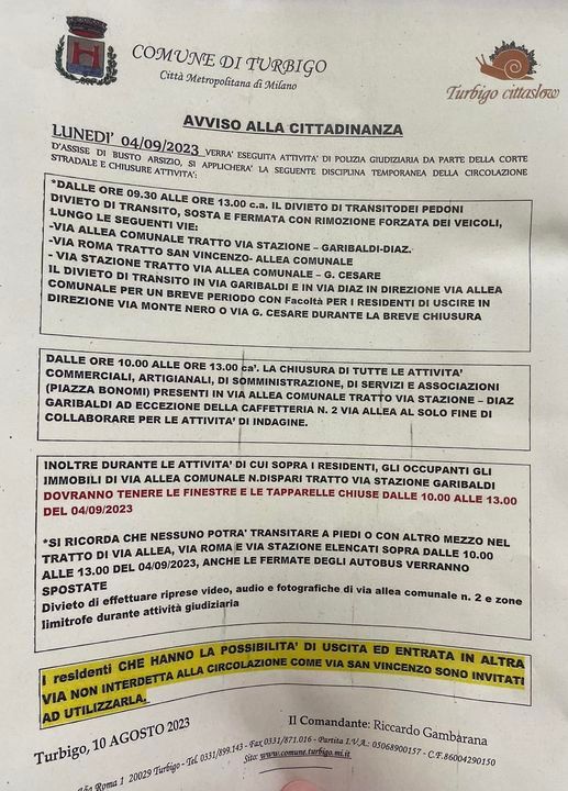 La mattina di lunedì 4 settembre, il tratto di via Allea compreso tra via Stazione e via Garibaldi-Diaz, rimarrà chiuso per disposizione del tribunale di Busto Arsizio che sta svolgendo il processo per la morte di Emanuel Rroku