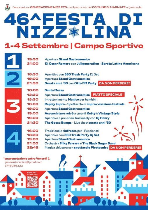 Anche quest’anno i volontari di Generazione Nizz hanno lavorato alacremente per regalare a tutti gli abitanti di Marnate, e a quelli dei paesi limitrofi, un lungo fine settimana di musica, arte, buon cibo e divertimento per tutti all’interno della cornice del campo sportivo di Nizzolina.