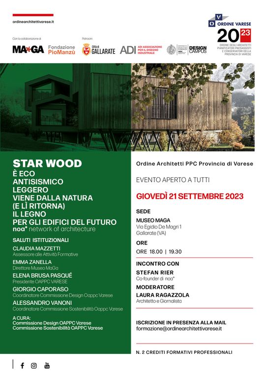 L'incontro dal titolo “Star wood - È eco, antisismico, leggero, viene dalla natura (e lì ritorna). Il legno per gli edifici del futuro” è in programma il 21 settembre alle 18, al Maga (via Egidio De Magri 1, Gallarate).