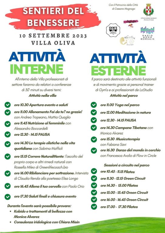 rofessionisti e professioniste proporranno al pubblico attività sportive, dedicate al benessere, e conferenze per rispondere alle tante curiosità dei cittadini in merito alle discipline e venire incontro alle più diverse esigenze. L’evento inizierà alle ore 10.30 e proseguirà fino alle 17.30, con appuntamenti e dimostrazioni cadenzati nel tempo, per dare ai presenti la possibilità di partecipare al maggior numero di attività possibile, nelle sale interne di Villa Oliva e negli ampi spazi all’aperto, nel parco della Magana, dove si svolgeranno le sessioni a circuito. Nel dettaglio, il programma.