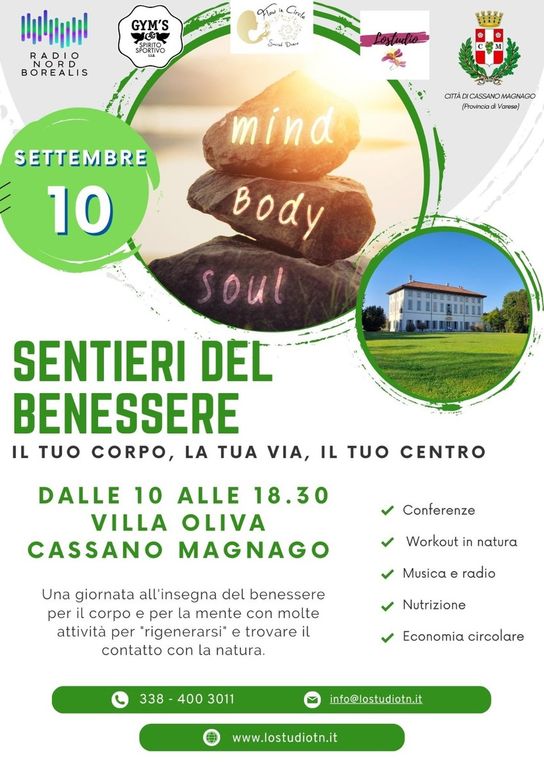 Dopo l’evento “Benessere in Rosa” tenutosi il 23 aprile per celebrare l’arrivo in città del Giro d’Italia, Sabrina Maffioli e Lo Studio presentano “Sentieri del Benessere” (locandine in fondo all’articolo). Appuntamento a Villa Oliva, domenica 10 settembre, in collaborazione con altre realtà associative del territorio tra cui Radio Nord Borealis, Gym's e Francesca Avolio. «L’evento, patrocinato dal Comune – annunciano gli organizzatori - intende raccogliere il pubblico intorno al claim: il tuo CORPO, la tua VITA, il tuo CENTRO».