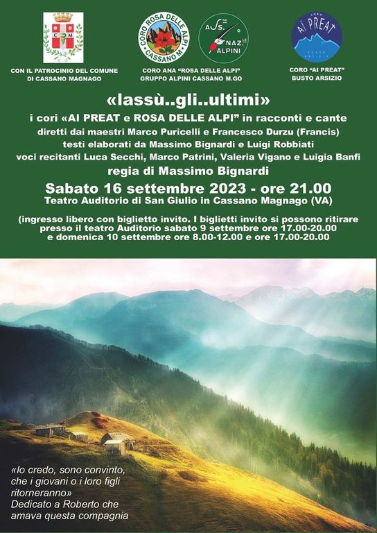 È in programma domani alle 21, al cinema teatro Auditorio di Cassano Magnago, “Lassù… gli… ultimi”, serata in parole e musica, con repertorio dedicato alla montagna, alla sue storie, ai suoi uomini (locandina in fondo). Sul palco, il coro Ana – Associazione Nazionale Alpini “Rosa delle Alpi” di Cassano e il coro di Busto Arsizio “Ai preat”, diretti dai maestri Marco Puricelli e Francesco “Francis” Durzu. Con la regia di Massimo Bignardi, le esibizioni canore si alterneranno ai testi elaborati da Luigi Robbiati e dallo stesso Massimo Bignardi. Voci recitanti di Luca Secchi, Marco Patrini, Valeria Vigano e Luigia Banfi. Patrocina il Comune di Cassano Magnago.
