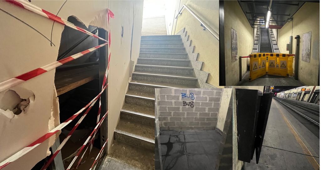 Ferma una scala mobile, mentre nei vani creati per le normative antincendio continua a comparire di tutto, tristemente: la foto non può anche rivelare l'odore, per fortuna. La consuetudine di orinare in questi spazi prosegue imperterrita e si sa che le cattive abitudini sono le peggiori da estirpare: questi fatti, inoltre, fanno percepire tutta l'insicurezza di quei vani, come già detto in passato, perché costituiscono un'area al riparo dagli sguardi. Si può fare di tutto, indisturbati, è la preoccupazione dei pendolari.