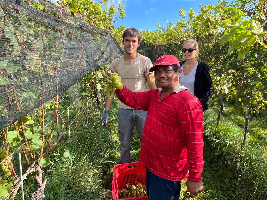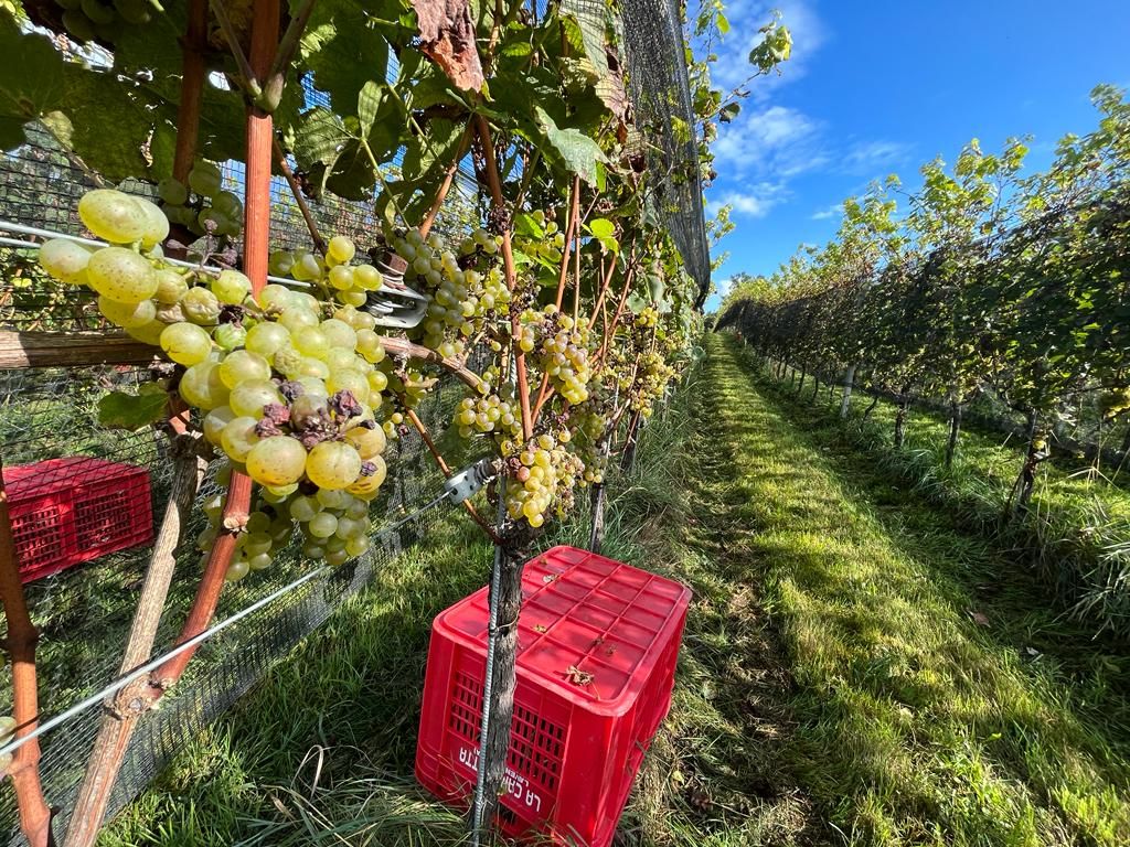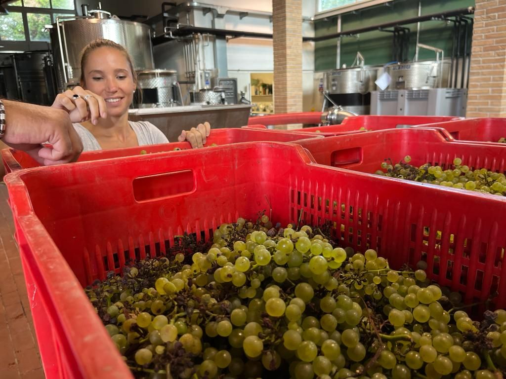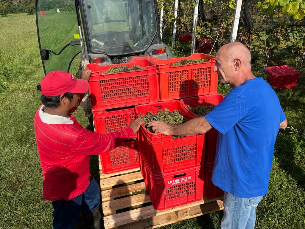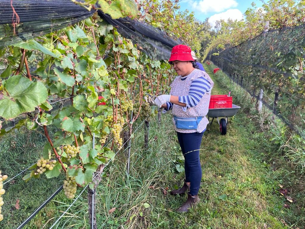 È stata un'annata non semplice, con una produzione che a causa delle bizze del clima si è ridotta al 50%. «C'è a chi è andata peggio - spiega l'enologo Giovanni - e si è visto azzerare il raccolto per colpa della grandine. Le reti ci hanno salvato. Qualitativamente però l'annata è ottima, i grappoli sono perfetti e il sole di quest'estate ha giovato alla maturazione». Una decina di collaboratori è impegnata nella raccolta tra i cinque ettari di filari. Non mancano sorrisi e battute, guidate dall'instancabile Joel, abile nel guidare il trattore e nel tenere alto il morale della truppa.
