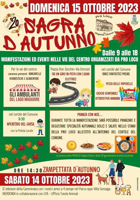 Ma la Sagra non è l’unico appuntamento del fine settimana olgiatese; da più di un decennio, infatti, l’Ufficio Tutela Animali ha deciso di far precedere alla domenica di festa la Zampettata d’Autunno, una camminata per le vie del paese a cui sono invitati tutti i cani olgiatesi insieme ai loro compagni di vita a due zampe.