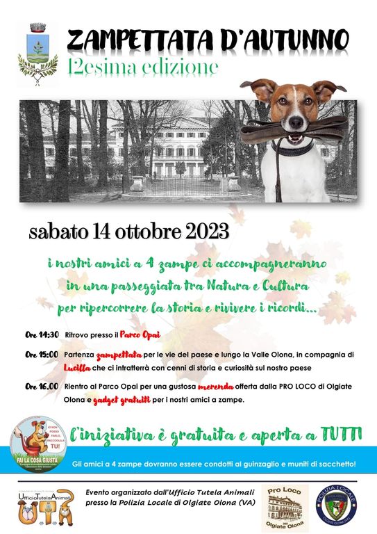 Il ritrovo per tutti è alle 14.30 di sabato 14 ottobre all’interno del parco Opai, da dove, alle 15, partirà la Zampettata vera e propria, che quest’anno sarà accompagnata da un’ospite davvero speciale, Lucilla, che durante la passeggiata in Valle e per le vie del paese intratterrà i partecipanti con cenni di storia e curiosità su Olgiate.