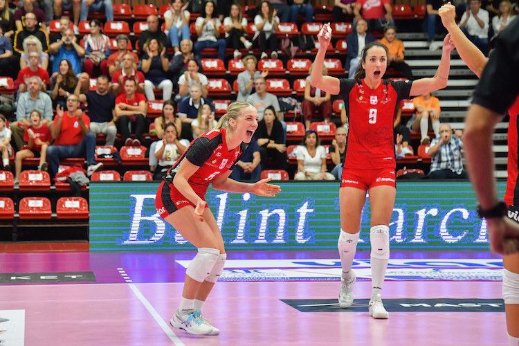TERZO SET: primo vantaggio della gara per le ospiti avanti tre lunghezze con Becic (4-7). La Futura si rimette subito sui giusti binari con il turno dai 9 metri di Conceicao e si gioca il punto a punto (8-9). Si tiene stretto il gap la squadra di Bosica che affonda nei tre metri con Bassi (11-14). Sul turno di servizio di Rebora le cocche costruiscono rimonta e nuovo equilibrio (16-16). Si gioca nel segno dell’equilibrio fino all’errore della ex biancorossa che vale il 20-18 per le cocche. Pigia sull’acceleratore la Futura che scappa 22-18. Ci pensa Rebora a mettere a terra la palla che vale due match ball (24-22). L’invasione delle ospiti mette la parola fine alla gara (25-22).