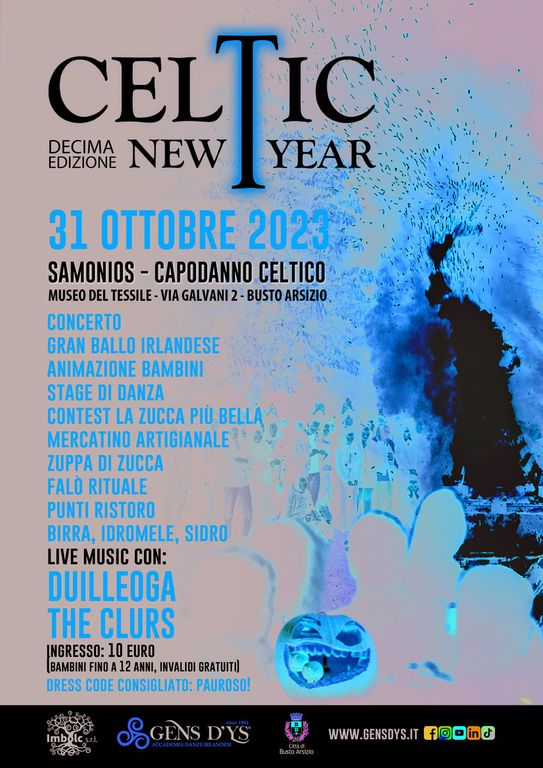 Martedì 31 ottobre 2023, al Museo del Tessile di Busto Arsizio, si festeggerà la decima edizione di Celtic New Year - Capodanno Celtico, organizzato dall’Accademia di Danze Irlandesi Gens d’Ys, con il Patrocinio dell’Amministrazione Comunale di Busto Arsizio (VA).
