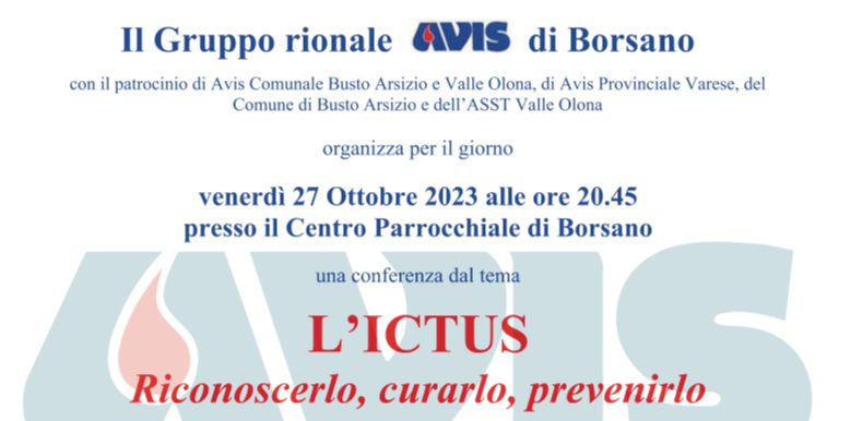 Venerdì 27 ottobre alle 20.45 al Centro Parrocchiale di Borsano si terrà la conferenza “L’Ictus - riconoscerlo, curarlo, prevenirlo” organizzata dal Gruppo rionale Avis di Borsano, con il patrocinio di: Avis Comunale Busto Arsizio e Valle Olona, Avis Provinciale Varese, Comune di Busto Arsizio e ASST Valle Olona.